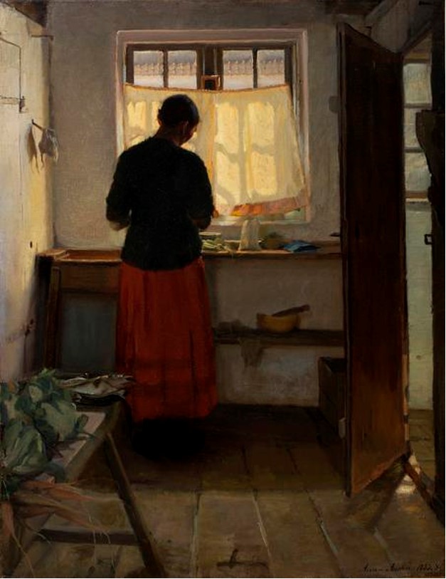 Ce qui constitue le regard spécifique d’Anna et qui, déjà, la distingue (souvenez-vous des Plumeurs de goélands), c’est la lumière qui dessine la forme de la fenêtre sur le rideau qu’elle sature de couleur et qui contraste radicalement avec le corsage noir de la servante, c’est la brume blonde du mur à gauche, où l’ombre du chiffon se dépose, c'est aussi le rayon de soleil, parallèle à la porte, strié des marques des petits bois de la fenêtre du couloir. Et pourtant, la scène est aussi une référence aux scènes domestiques hollandaises.
